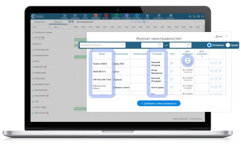 Одной из основных задач механика является контроль наличия неисправностей по объектам, а также их своевременное устранение. С помощью приложения BTS Driver водители отмечают обнаруженные в начале или в конце поездки неисправности в автомобилях, которые затем верифицируются механиками и фиксируются в “Журнале неисправностей”. Однако иногда по некоторым неисправностям необходимо задать уточняющие вопросы, обнаружившим их сотрудникам. Для того чтобы сразу понимать, с каким сотрудником следует связаться для уточнения, в “Журнал неисправностей” добавлено поле “Сотрудник”.