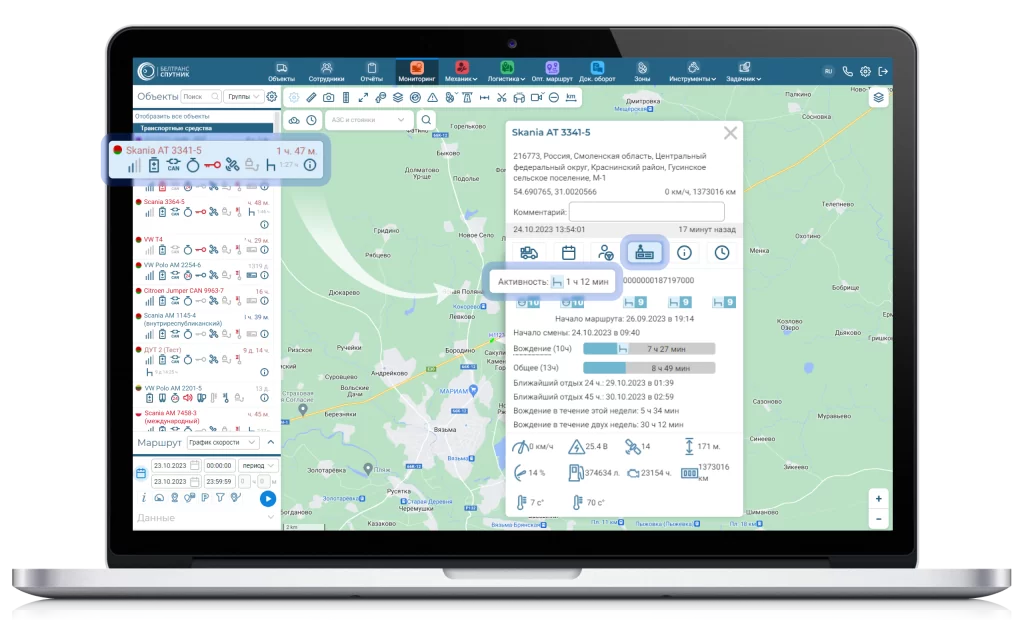 Также была добавлена возможность отслеживать статус активности с тахографа сразу по всем объектам